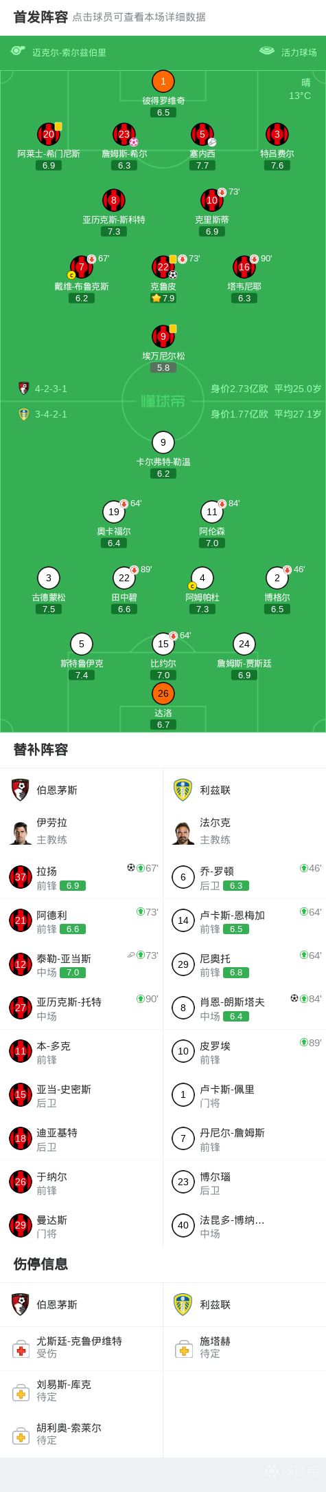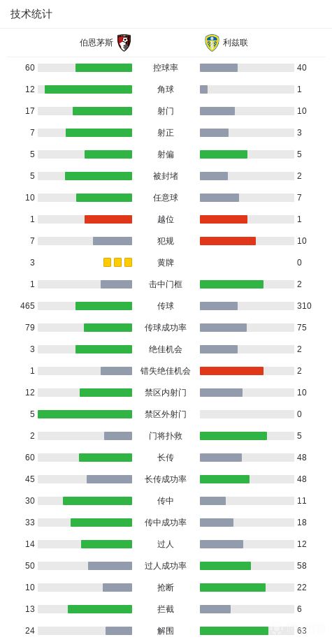 关键事件第60分钟,塞内西斜塞,克鲁皮插上破门,伯恩茅斯1-0利兹联