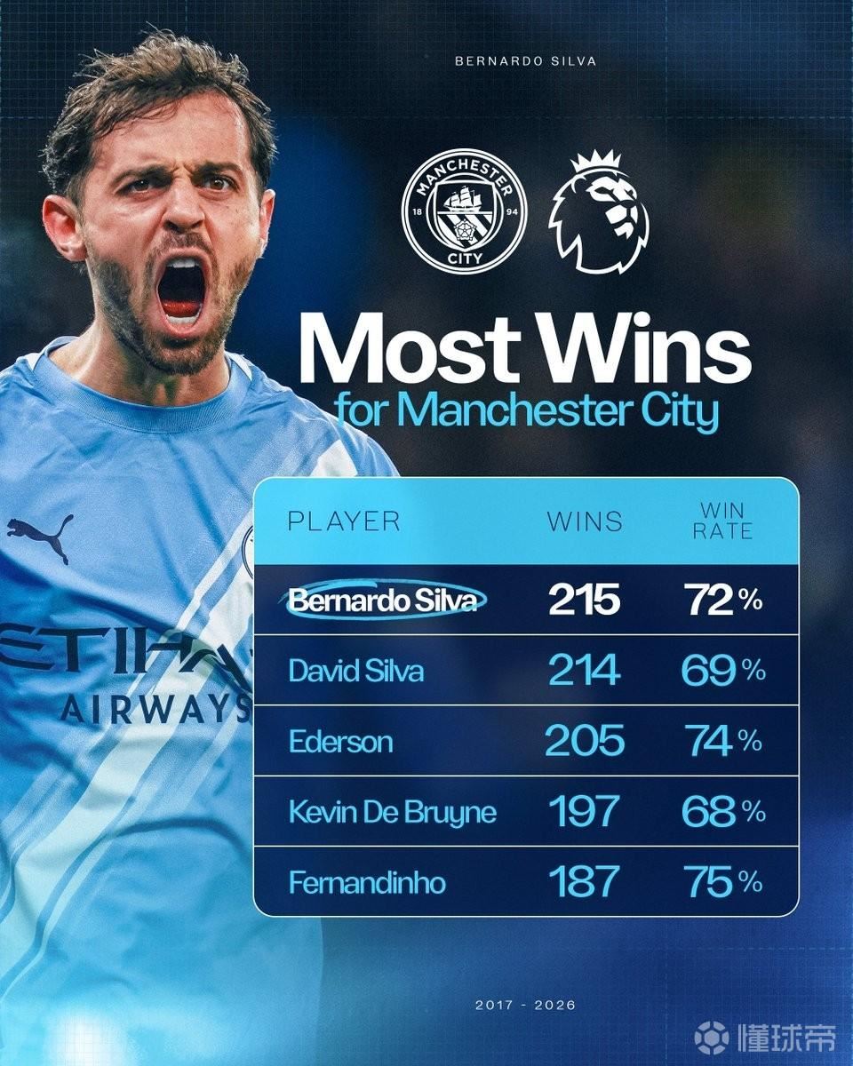 曼城队史英超取胜场次前5:1. 伯纳多-席尔瓦 215胜 胜率72%