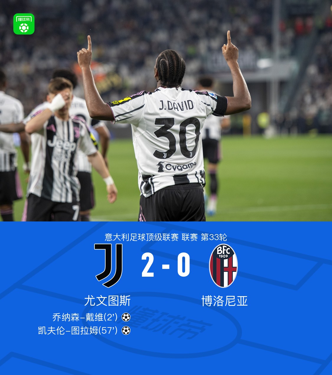 北京时间4月20日2:45,意甲第33轮,尤文图斯主场对阵博洛尼亚。上半场,乔纳森-戴维头球破门,孔塞桑破门被吹越位在先,进球无效,随后孔塞桑禁区内小角度推射被门将挡出,霍尔姆抽射击中门框。下半场,凯夫伦-图拉姆头球破门,最终,尤文2-0战胜博洛尼亚。