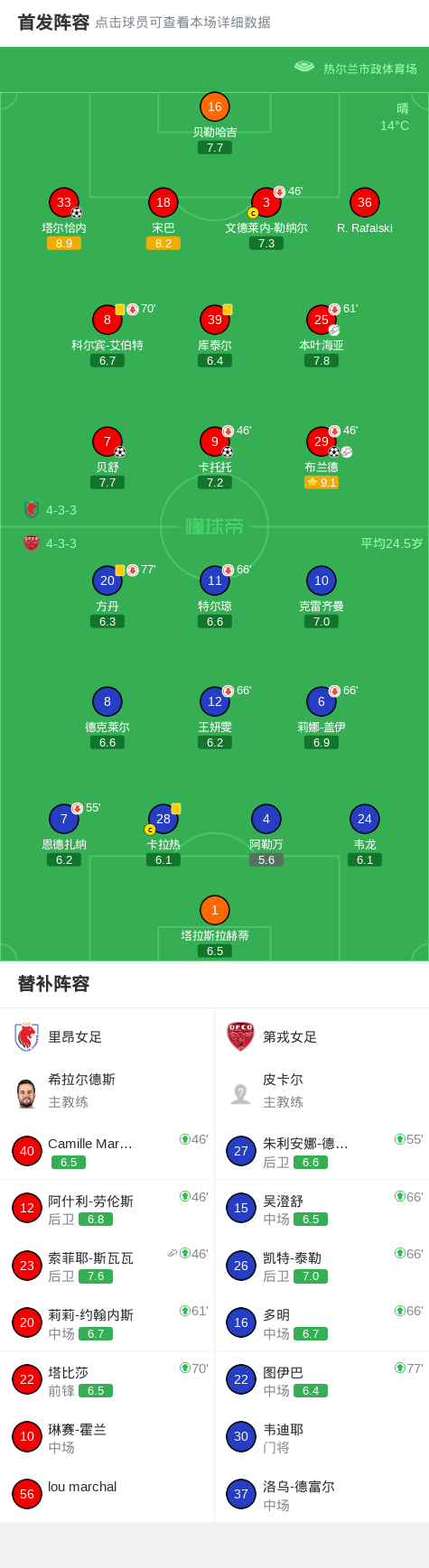 北京时间4月23日法国女子甲组联赛 联赛 第20轮,里昂女足主场对阵第戎女足。里昂女足布兰德破门,卡托托破门,塔尔恰内破门,贝舒破门。最终比分里昂女足 4-0 第戎女足。