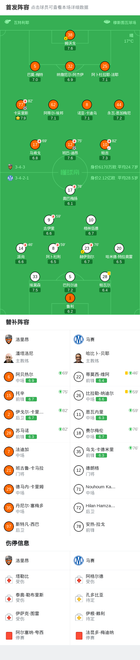 关键事件第28分钟,卡采里斯近距离推射破门!洛里昂1-0马赛