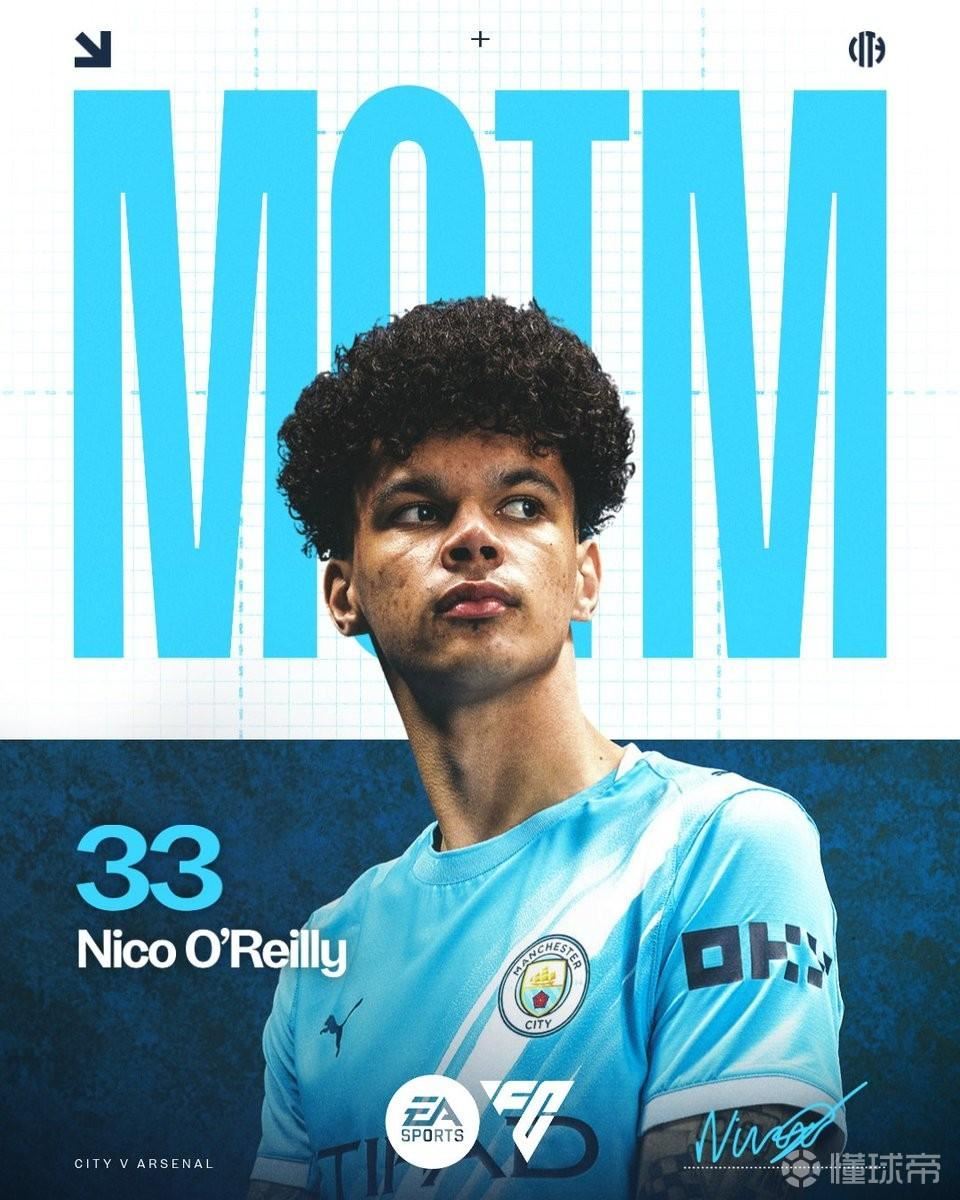 北京时间4月20日,在英超第33轮的天王山之战中,谢尔基和哈兰德的进球帮助曼城主场2-1战胜了阿森纳,赛后此战表现出色的尼科-奥赖利当选曼城队内的全场最佳球员。