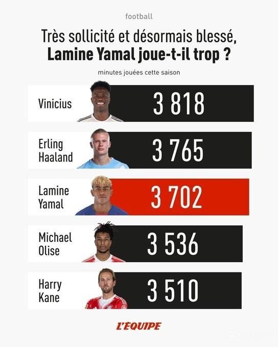 本赛季,亚马尔代表俱乐部出场45次,累计出场时间达到3702分钟,使他成为欧洲五大联赛出场时间第三多的前锋,仅次于维尼修斯(3818分钟)和哈兰德(3765分钟)。