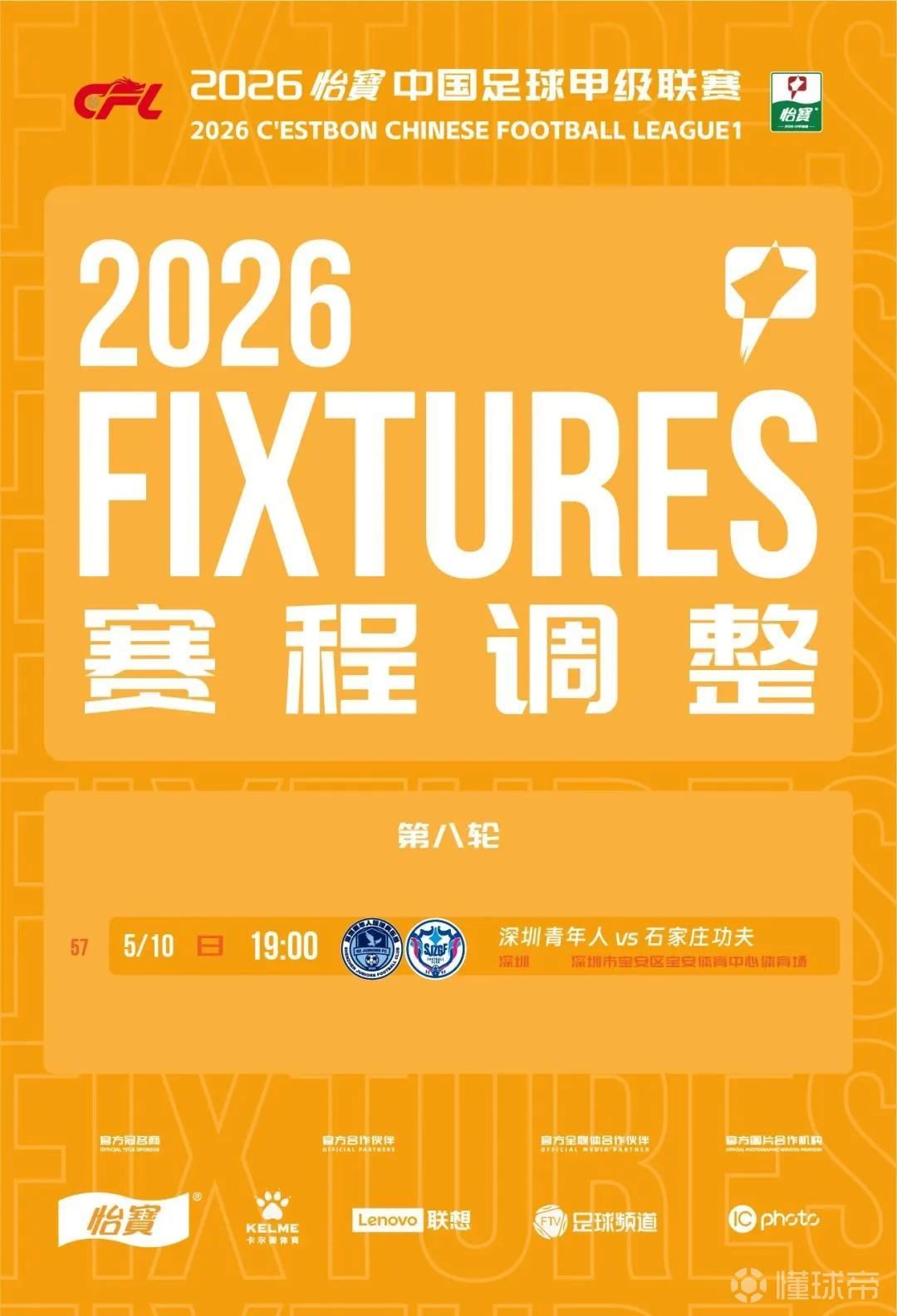 根据2026怡宝中甲联赛赛程,深圳青年人对阵石家庄功夫的比赛原定于5月9日19:00进行。因举办大型活动,为确保赛事安全有序进行,经深圳青年人足球俱乐部和赛区联合申请,并协商客队俱乐部及有关方同意,现决定调整深圳青年人对阵石家庄功夫的比赛日期,其他比赛安排不变。