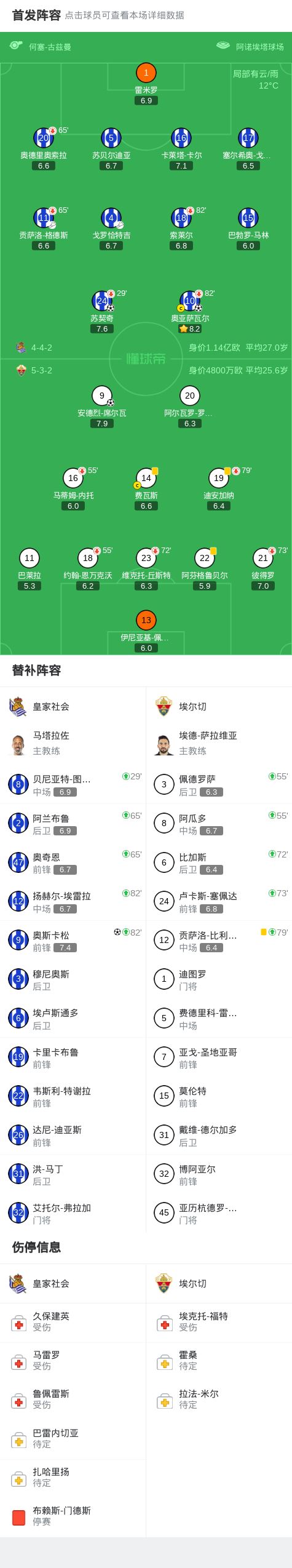 北京时间2月8日西班牙足球甲级联赛 联赛 第23轮,皇家社会主场对阵埃尔切。皇家社会苏契奇破门,奥亚萨瓦尔破门,奥斯卡松破门。埃尔切安德烈-席尔瓦破门。最终比分皇家社会 3-1 埃尔切。
