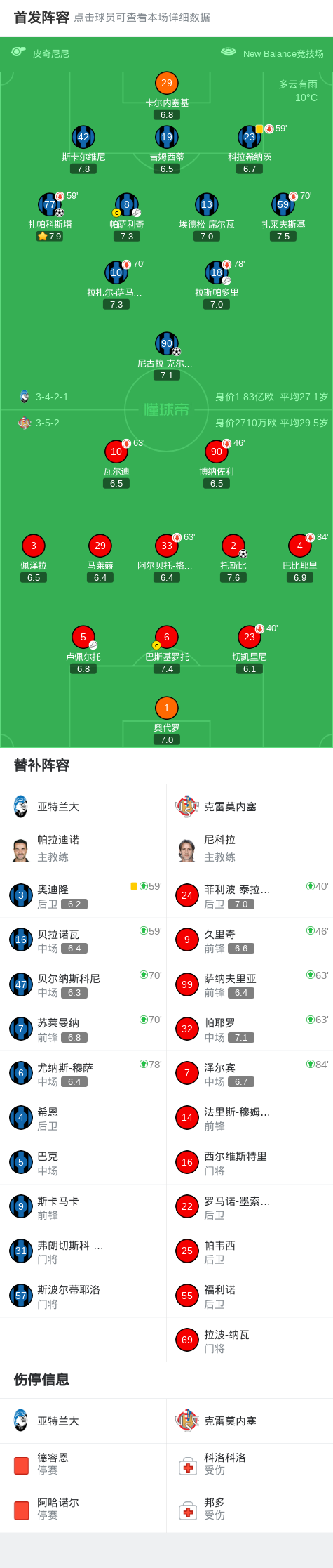北京时间2月10日意大利足球甲级联赛第24轮,亚特兰大主场对阵克雷莫内塞。比赛中,亚特兰大球员率先建功,尼古拉-克尔斯托维奇接队友传球破门;随后扎帕科斯塔也通过队友助攻打入一球,帮助球队取得领先。下半场补时阶段,克雷莫内塞球员托斯比接队友传球扳回一球。最终比分定格为亚特兰大2-1克雷莫内塞。
