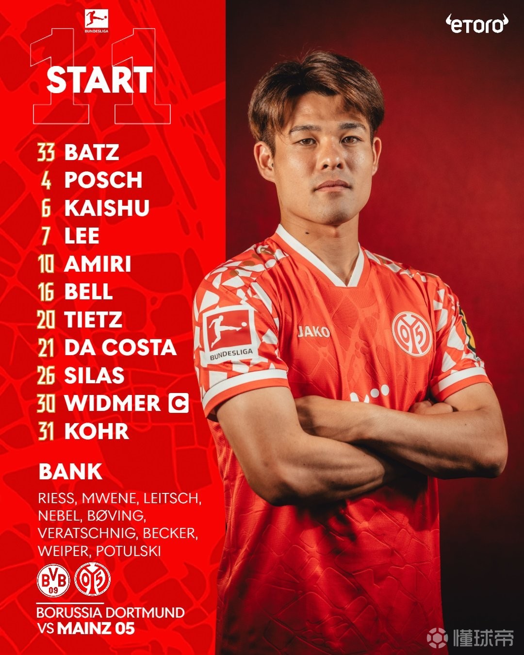 北京时间2月14日03:30,德甲 第22轮,多特蒙德坐镇主场迎战美因茨,赛前双方球队首发名单公布如下: