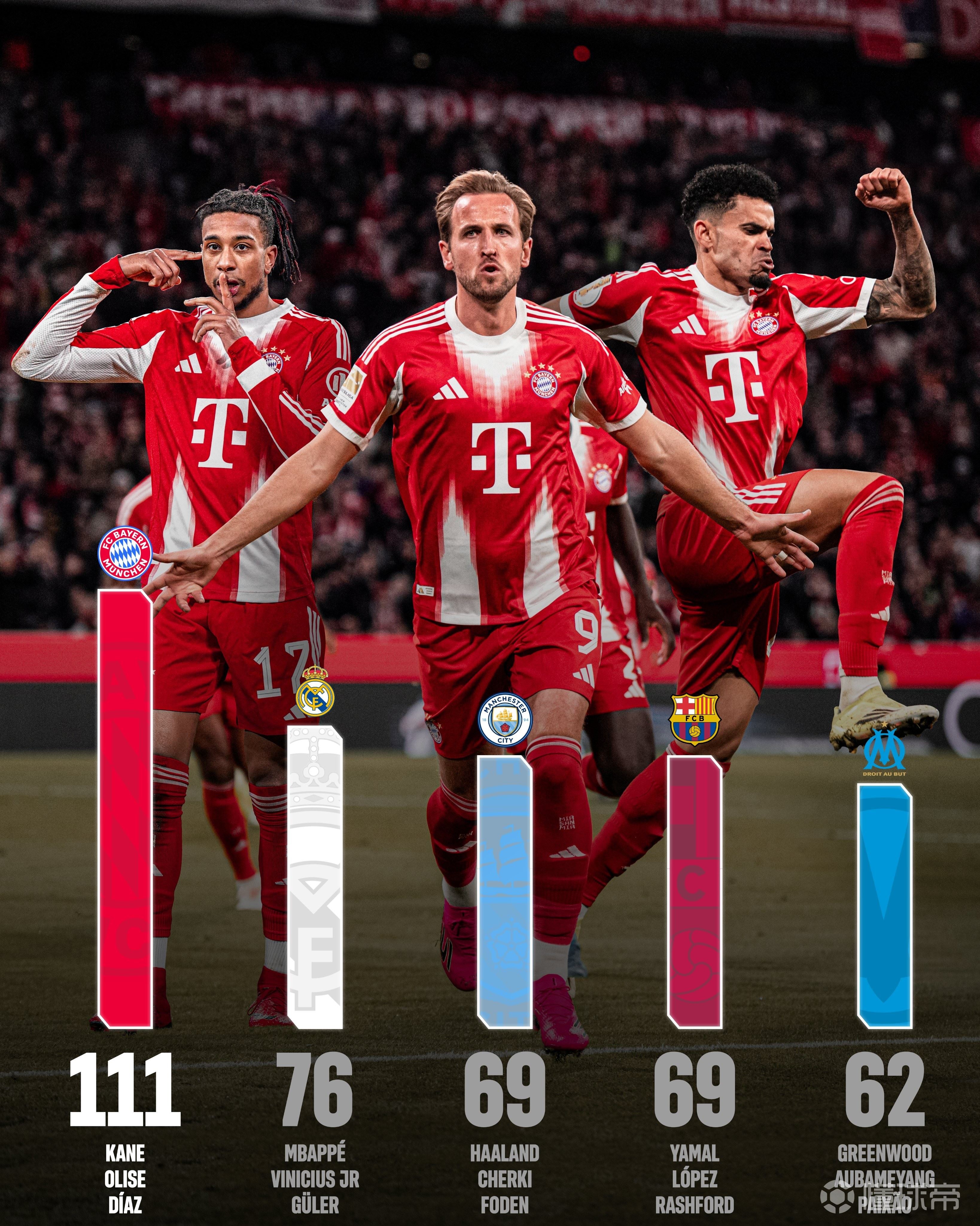 赛季至今,凯恩贡献41球5助攻,迪亚斯19球12助攻,奥利塞13球21助攻,三人参与进球数合计为111球(不过这不代表三人共制造111球,其中包括彼此的助攻与进球)。