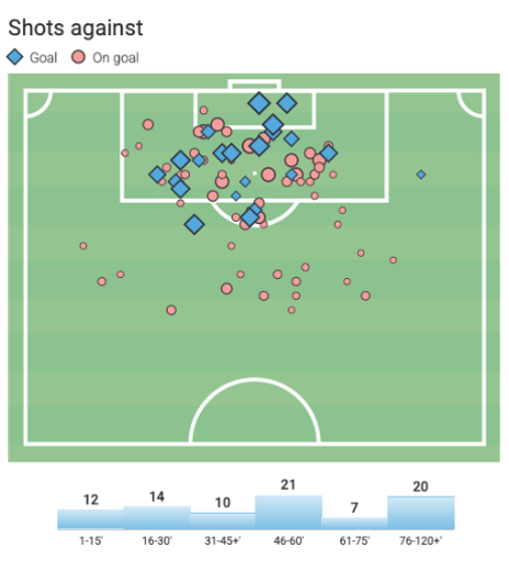 如果现在再回看迪亚斯的参与进球和参与制造得分机会完整点位图,你会发现,迪亚斯最有威胁的时间主要集中在下半场前半段和后半段,这两个足球比赛尤为关键的时期。本赛季,拜仁在落后或胶着的比赛中,迪亚斯贡献7球4助,独造11球,占球队胶着局进球数的42%。迪亚斯的所有数据,都是在全德甲所有球员压力值最大的情况下取得的,即便这样他竟然只是本赛季德甲场均评分第二的左边锋,但所有数据都能证明迪亚斯有一颗大心脏。