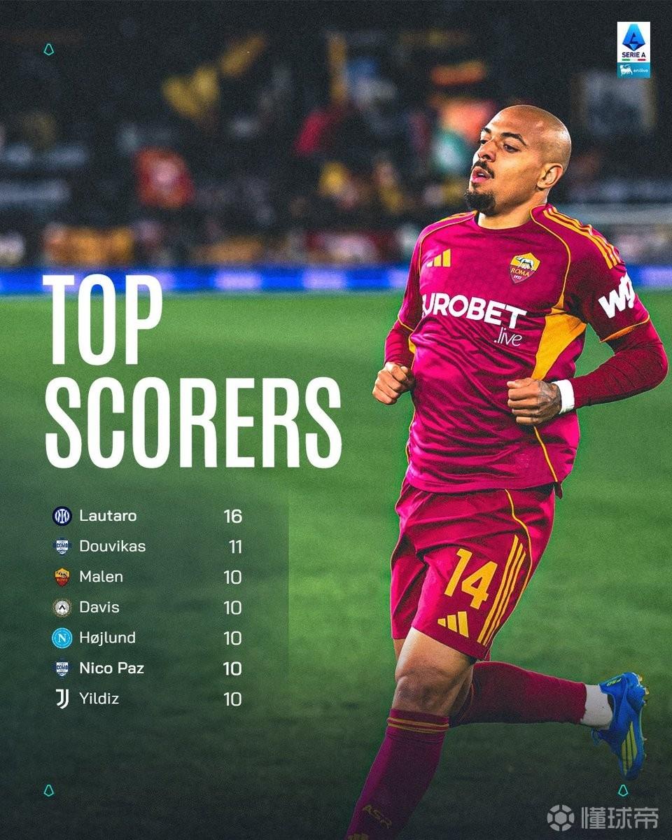 冬窗才加盟,罗马前锋马伦12场10球并列意甲射手榜第三