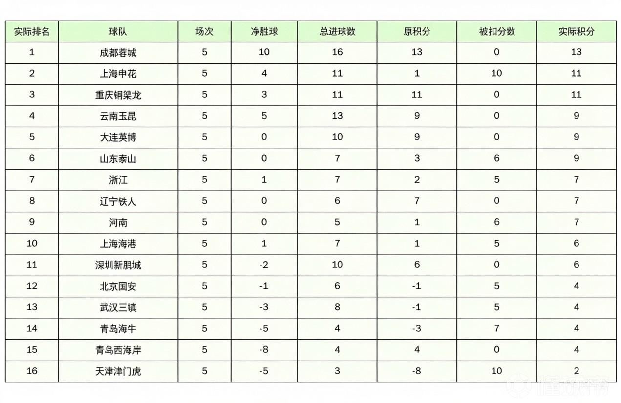 中超未扣分积分榜:成都仍榜首,申花第二,津门虎仍垫底