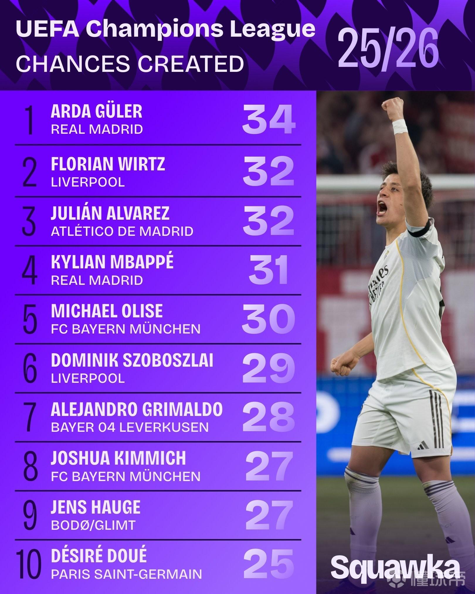 本赛季欧冠创造机会榜:居莱尔居首,维尔茨、小蜘蛛并列第二