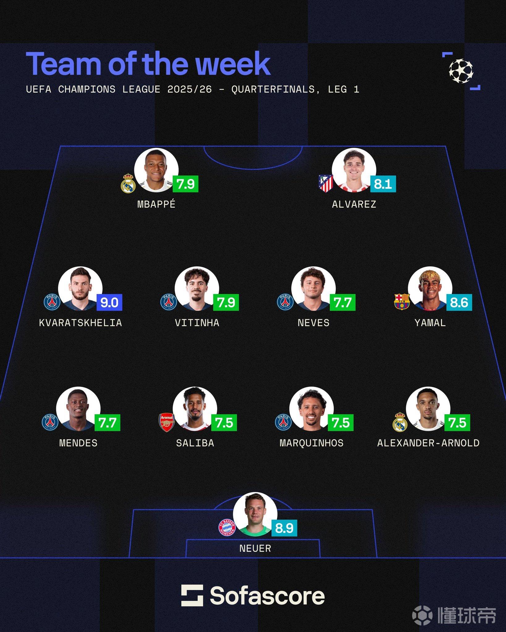本周欧冠最佳阵容:诺伊尔最佳门将,巴黎五人入选