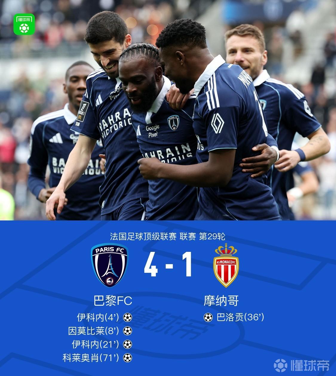 巴黎FC 4-1摩纳哥,伊科内双响,因莫比莱建功