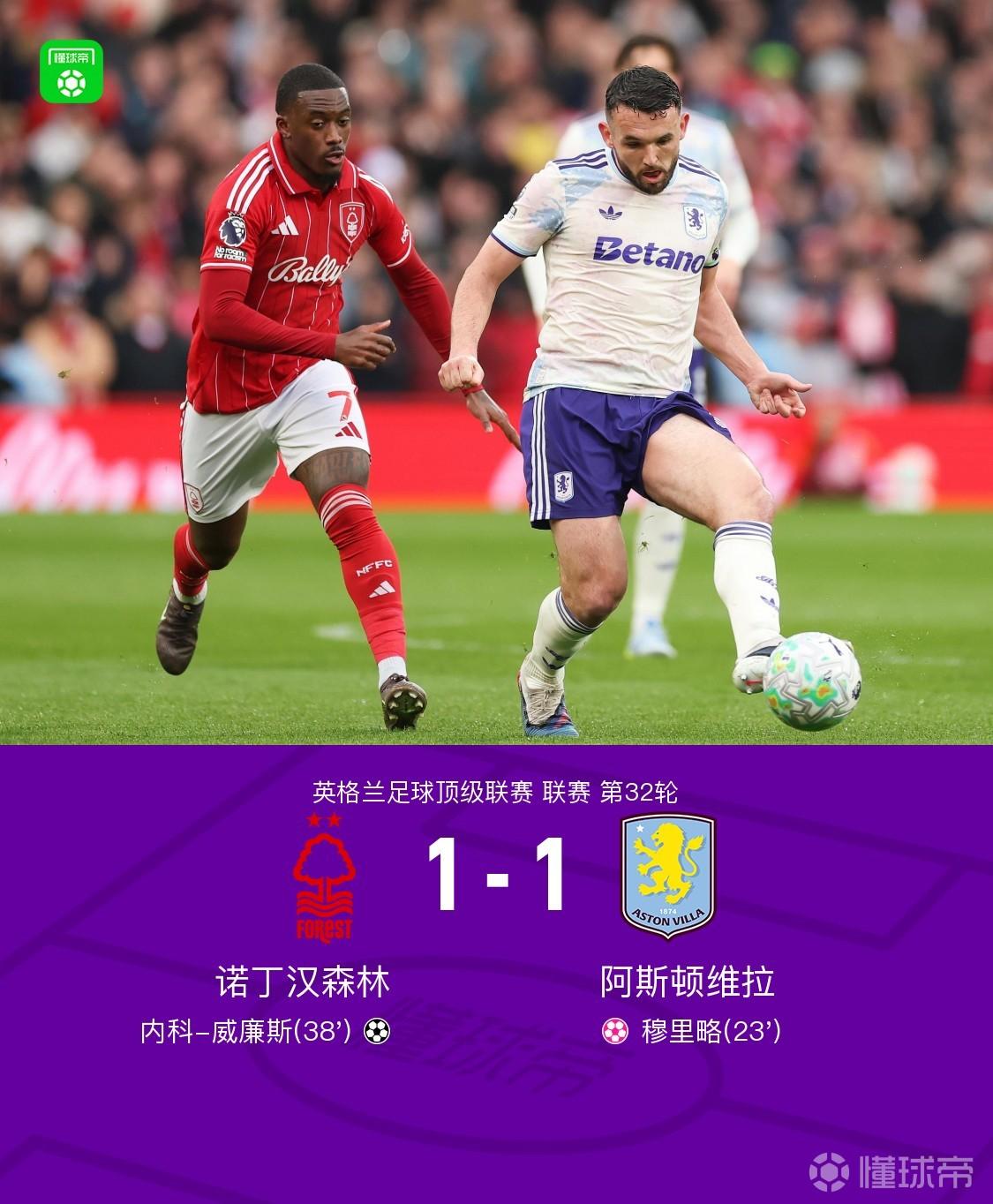 诺丁汉森林1-1维拉,内科-威廉斯建功,穆里略乌龙