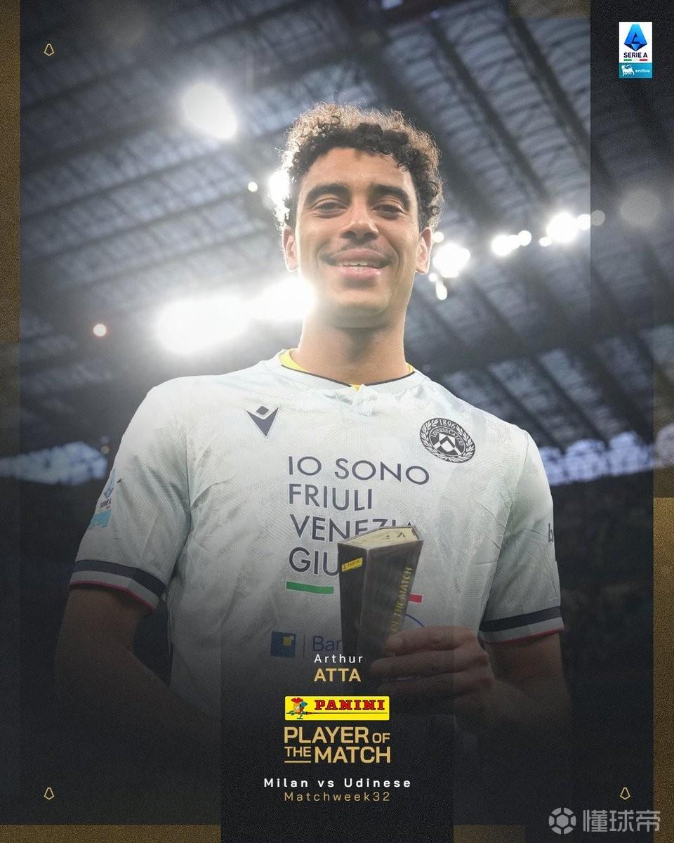 造乌龙+进球,阿塔当选乌迪内斯客场3-0米兰全场最佳球员