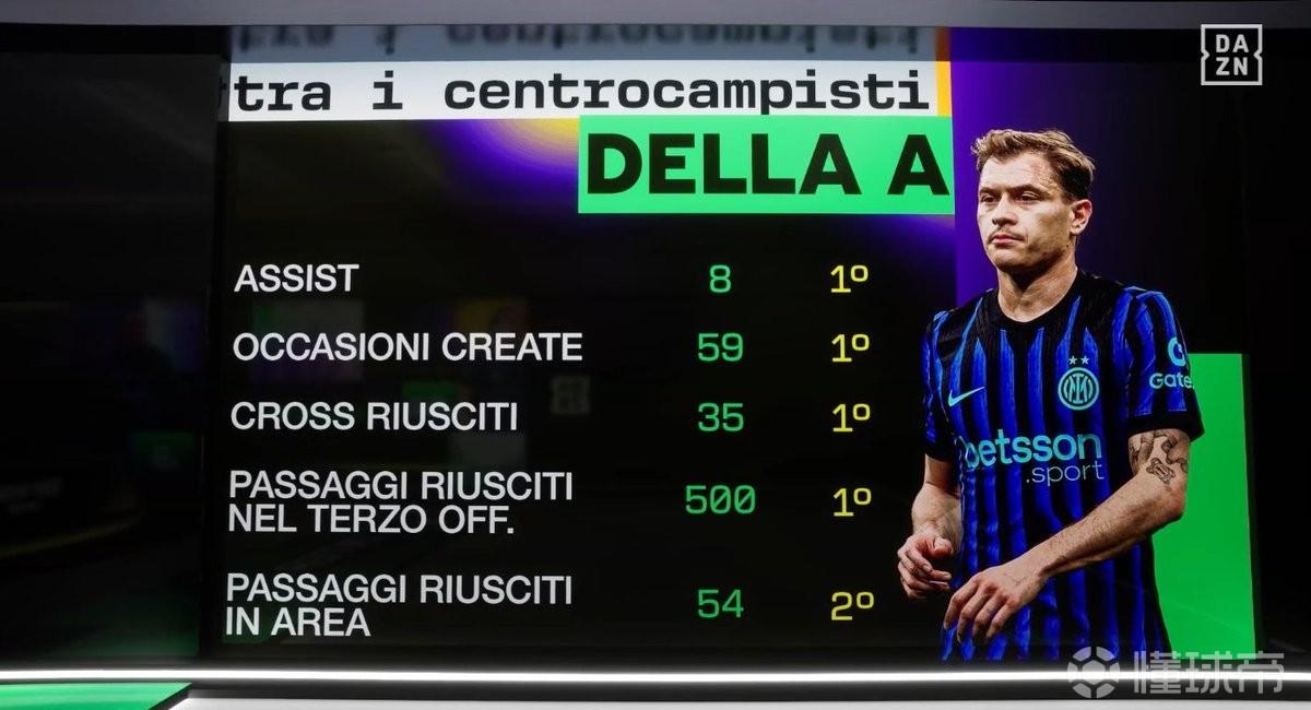巴雷拉四大数据位列意甲中场第一,含8次助攻以及创造59次机会
