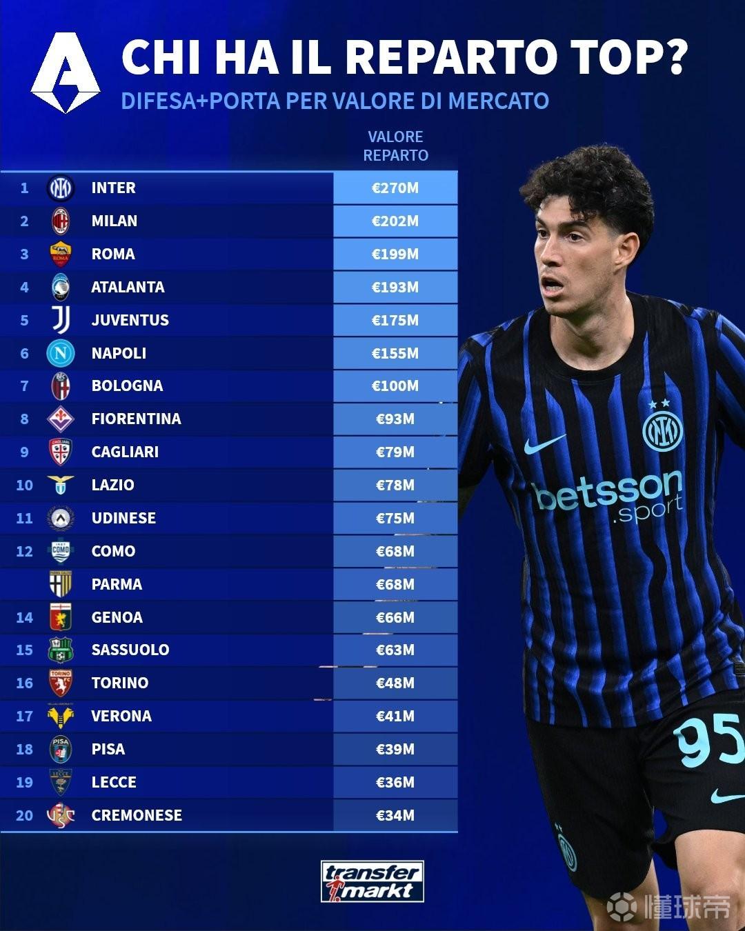 德转列意甲俱乐部三条线身价:国米防线第一,尤文锋线最高