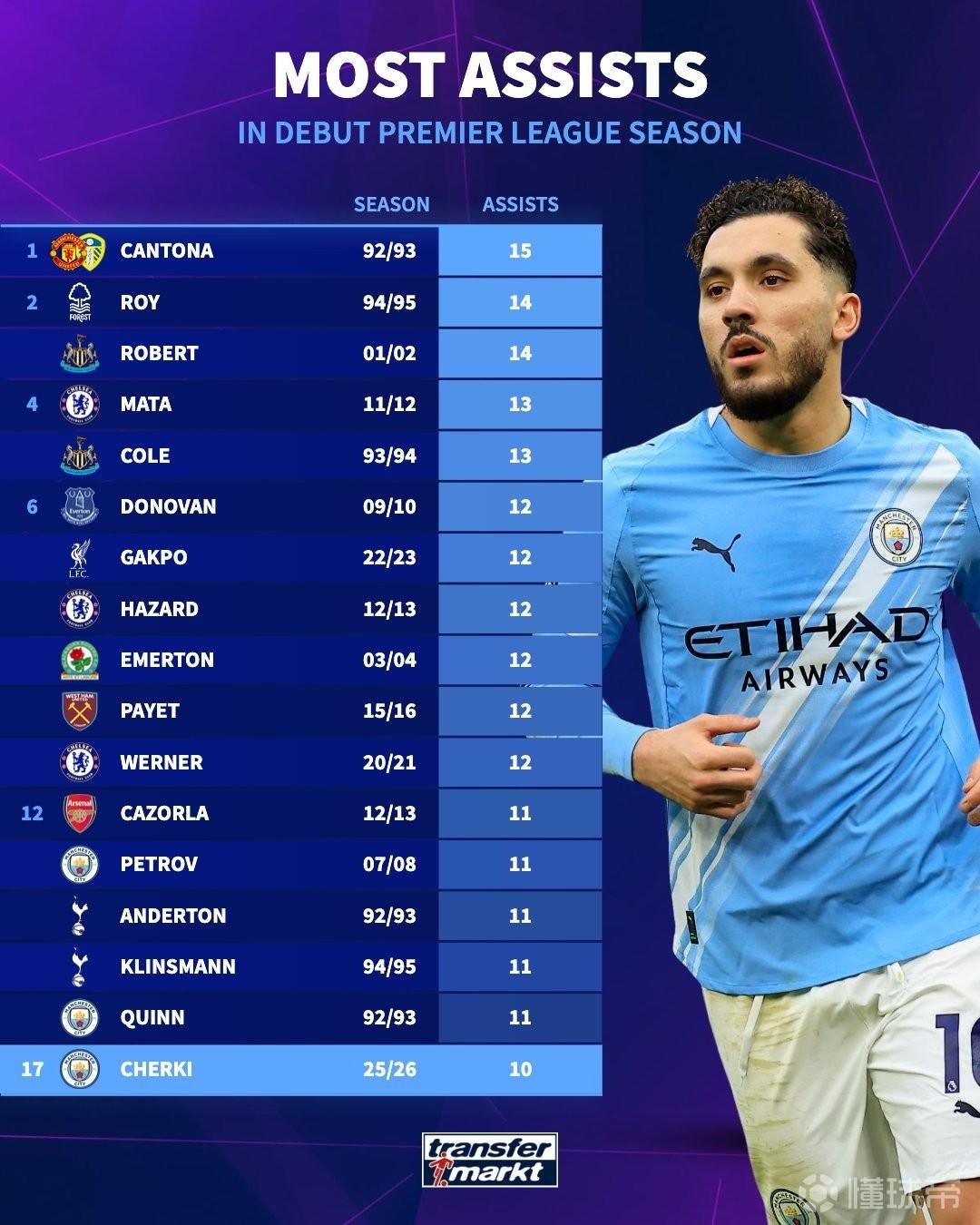 英超处子赛季助攻榜:坎通纳15次居首,谢尔基10次暂列第17