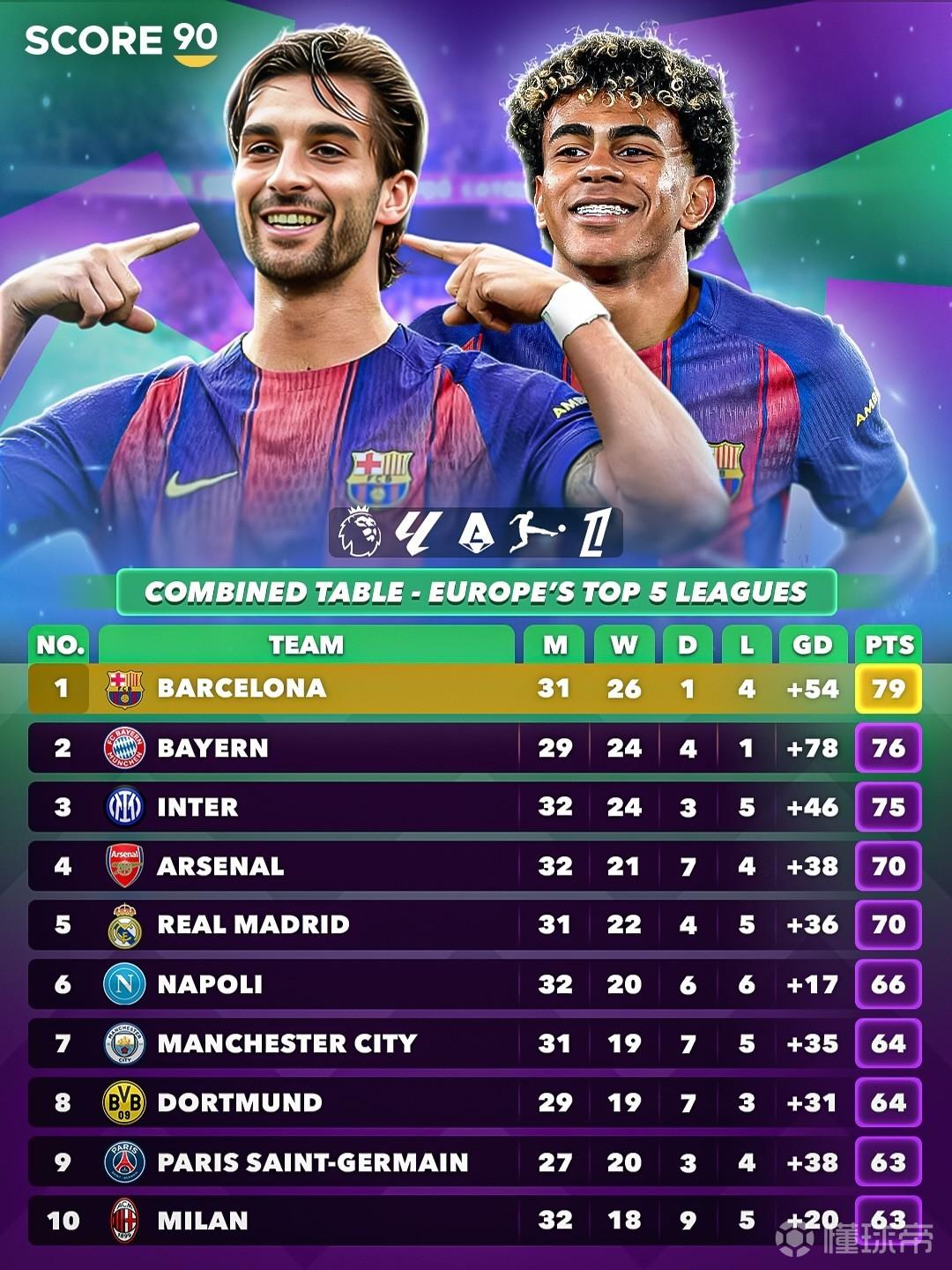 外媒合并五大联赛积分榜:巴萨31场79分居首 拜仁第二