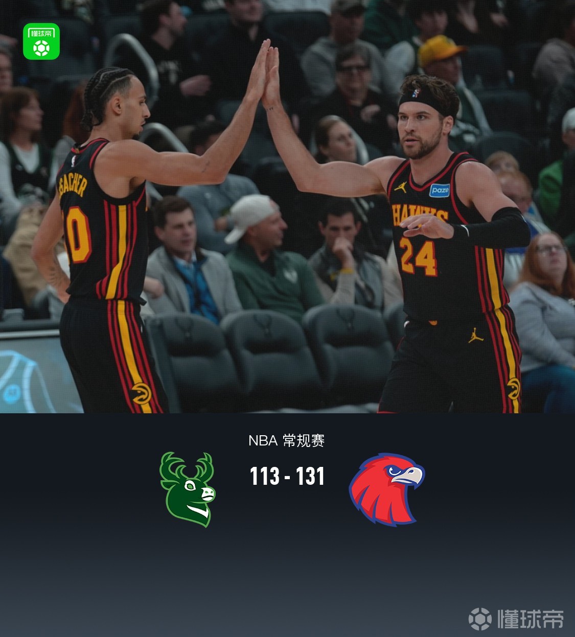 密尔沃基雄鹿字母哥24分5板4助,库兹马16分2板2助;亚特兰大老鹰亚历山大-沃克23分1板2助,奥孔古21分8板1助。