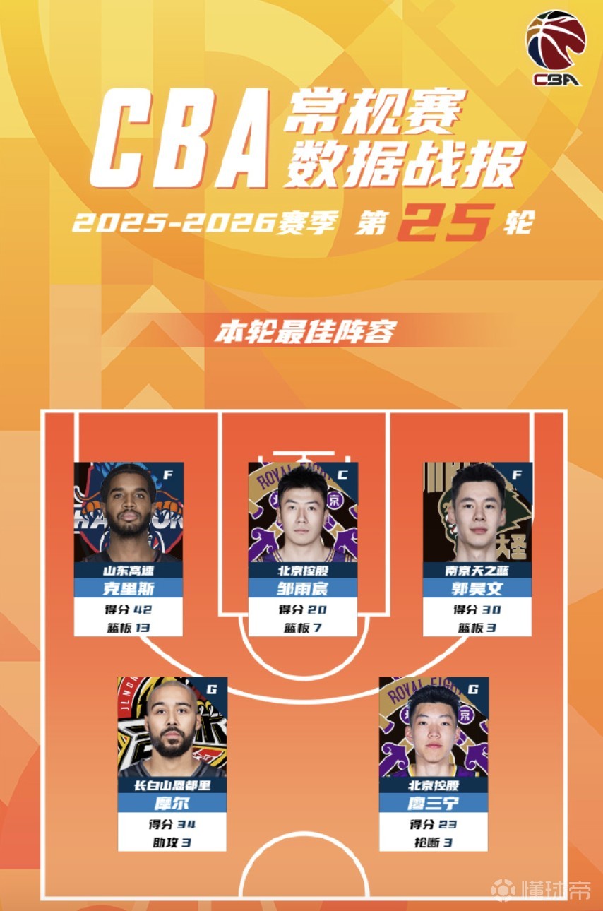 北京时间3月15日,CBA官方公布了常规赛第25轮的最佳阵容,山东外援克里斯,同曦后卫郭昊文,吉林外援摩尔,北控球员邹雨宸和北控后卫廖三宁入选。