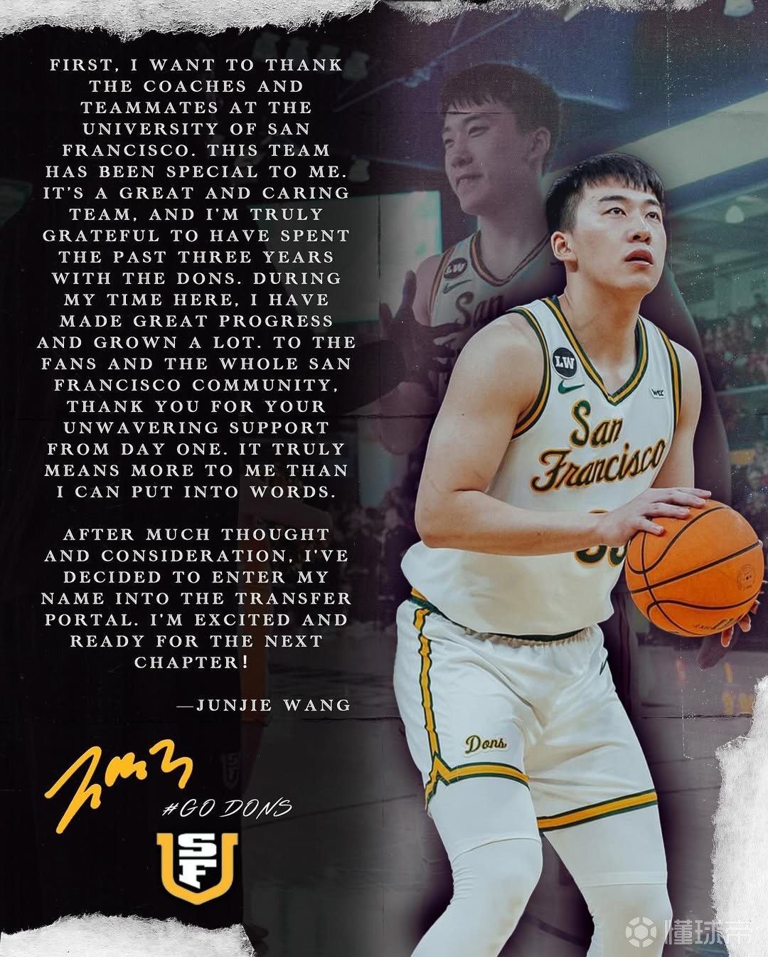 王俊杰在个人社交媒体写道:“首先,我要感谢旧金山大学的教练和队友们。这支球队对我来说很特别。”