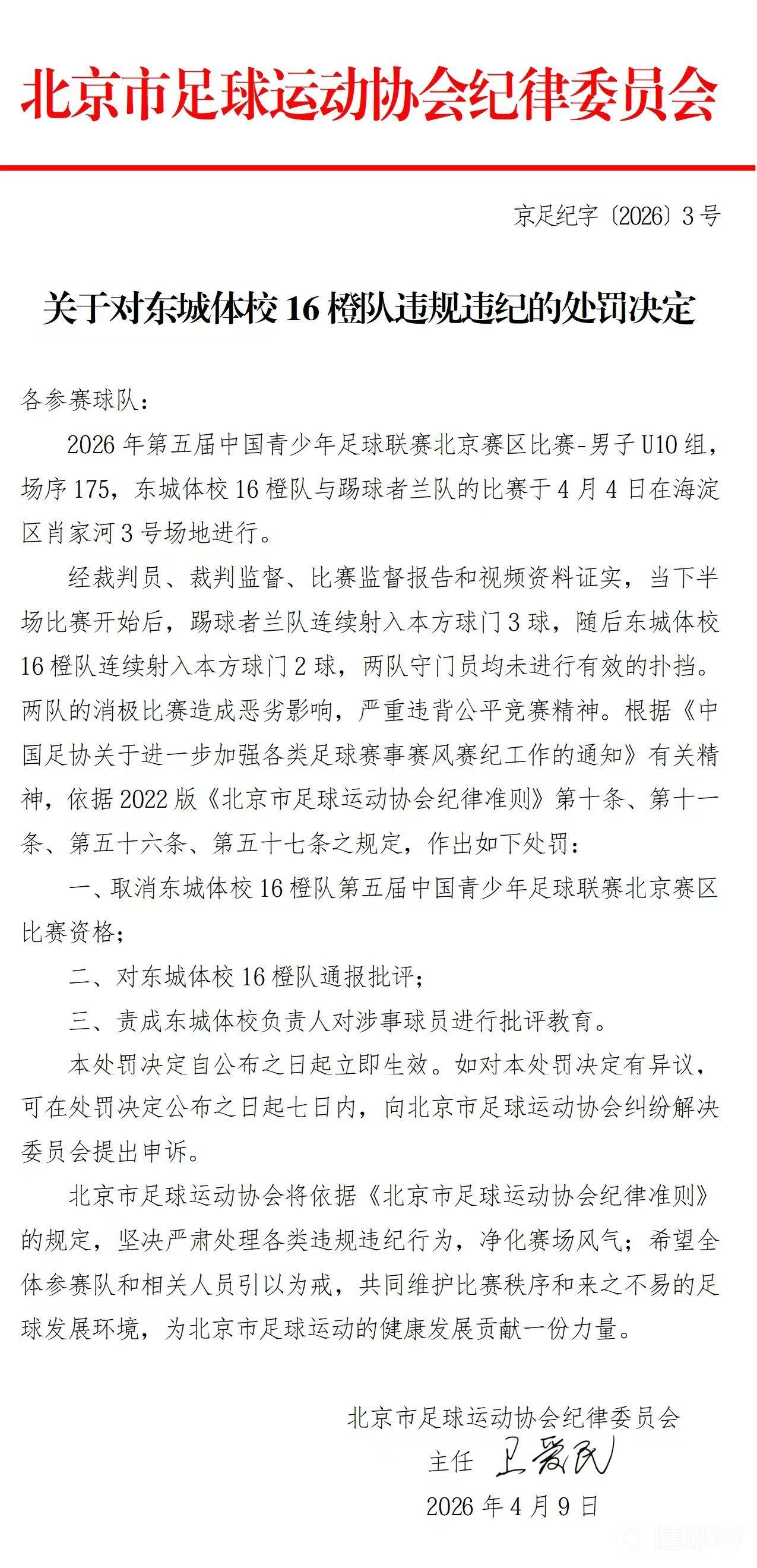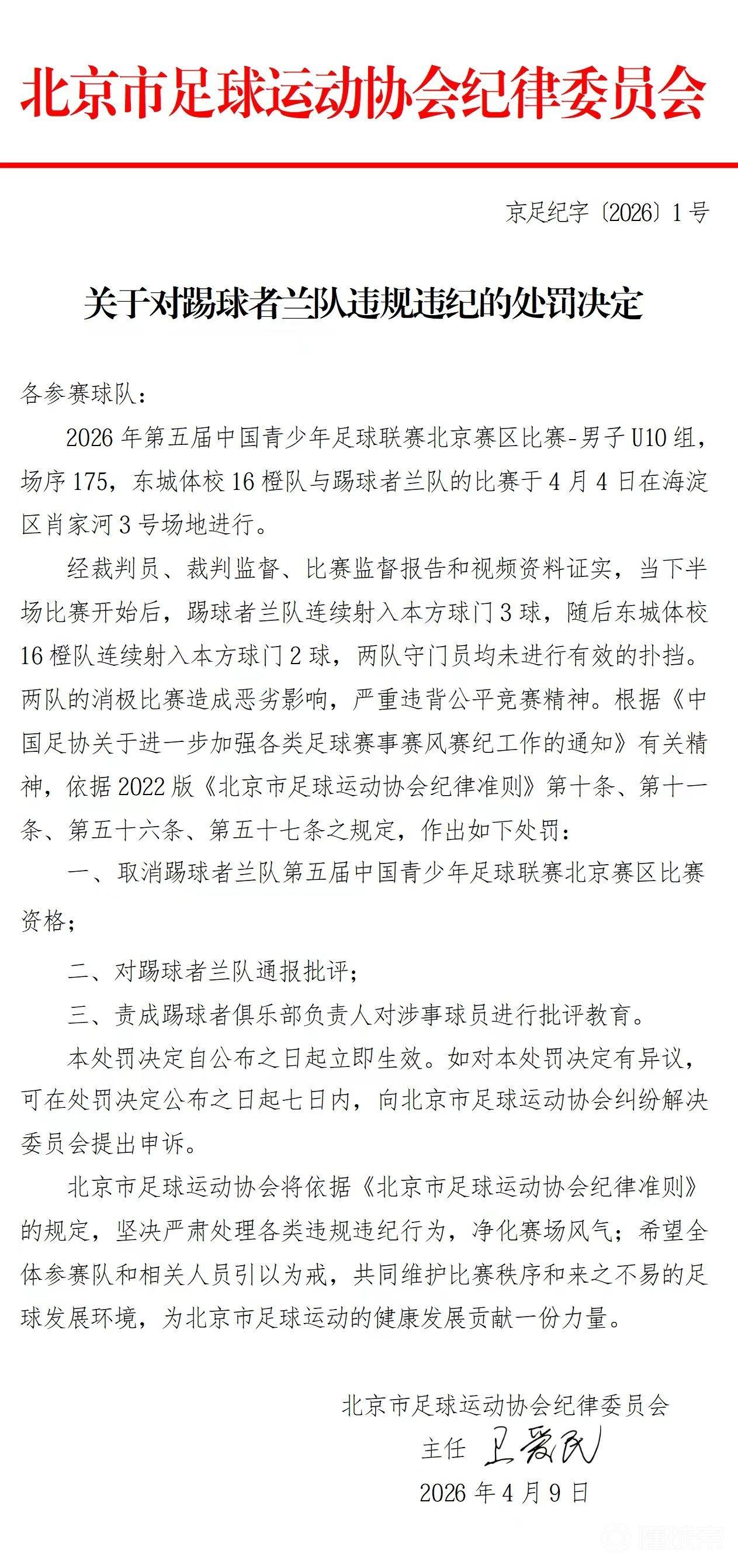 4月9日,北京市足协官方消息,在中青赛北京赛区U10组东城体校16橙队与踢球者兰队的比赛中,双方在下半场连续互射自家球门,均被取消比赛资格。