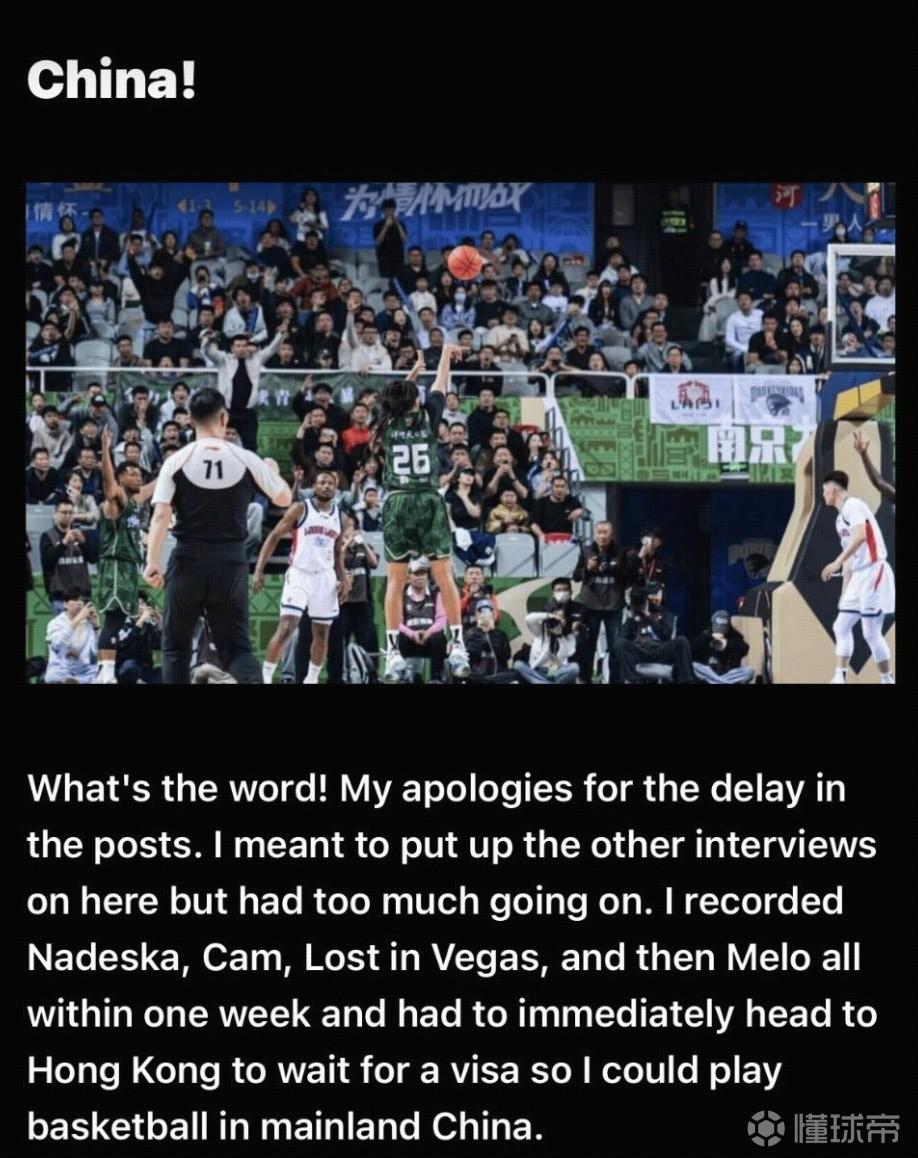 大家好!抱歉拖了这么久才更新动态。本来打算把其他采访发上来的,但最近事情实在太多了。我一周内录完了 Nadeska、Cam、Lost in Vegas 还有 Melo 的采访,紧接着就得飞去香港等签证,好来中国大陆打职业篮球。