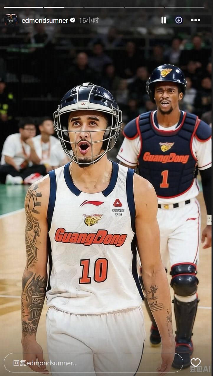 赛后,广东外援萨姆纳和奎因都在社媒发了一张自己带护具上场的AI图片。