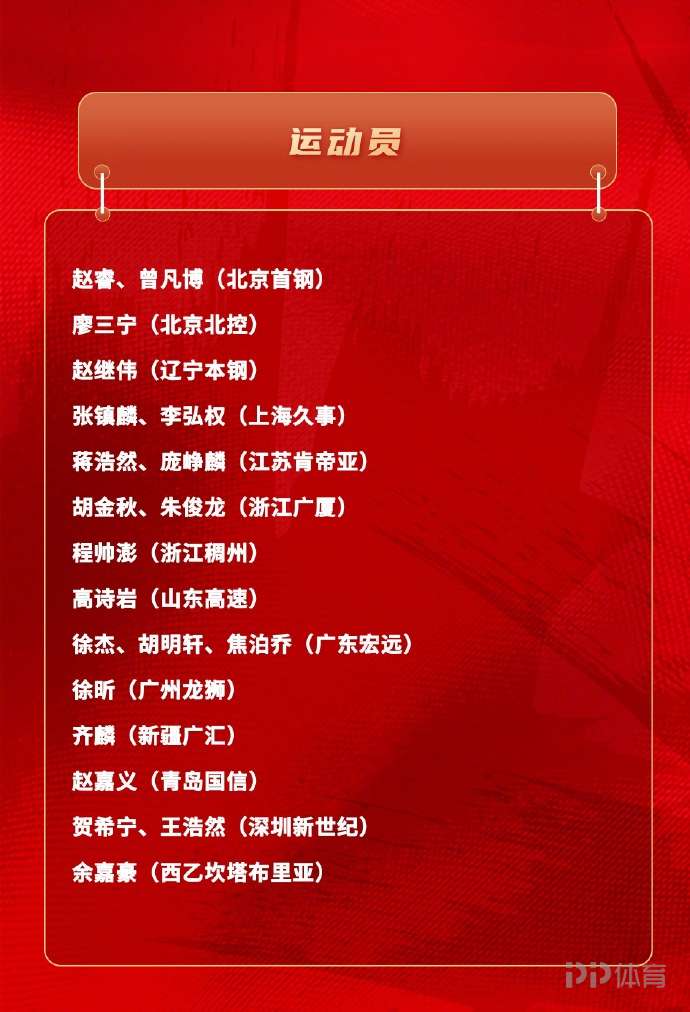 赵睿、曾凡博(北京首钢)、廖三宁(北京北控)、赵继伟(辽宁本钢)、张镇麟、李弘权(上海久事)、蒋浩然、庞峥麟(江苏肯帝亚)、胡金秋、朱俊龙(浙江广厦)、程帅澎(浙江稠州)、高诗岩(山东高速)、徐杰、胡明轩、焦泊乔(广东宏远)、徐昕(广州龙狮)、齐麟(新疆广汇)、赵嘉义(青岛国信)、贺希宁、王浩然(深圳新世纪)、余嘉豪(西乙坎塔布里亚)。