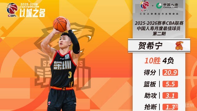 CBA官方社交媒体写道:深圳新世纪烈豹篮球俱乐部球员贺希宁在第10-23轮的比赛中,帮助球队取得其中10场胜利,在场均出战34分钟的时间里,能够得到20.9分、5.5篮板、3.1助攻、1.3抢断的全面数据,投篮命中率接近50%,并且能够以42.3%的三分命中率场均命中3.1记三分。