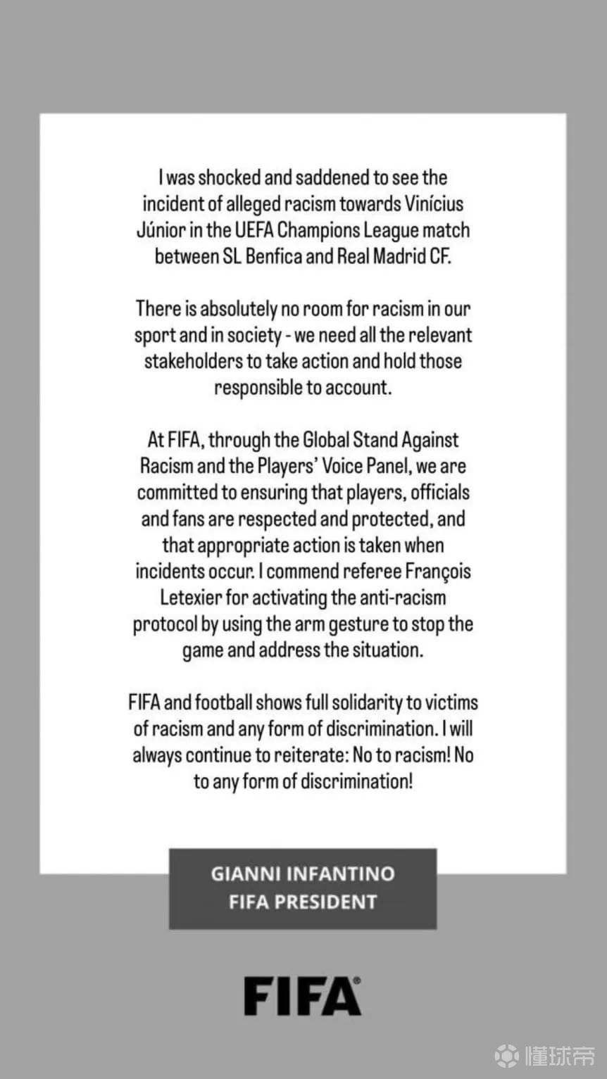 在国际足联,我们通过“全球反种族主义立场”和“球员之声小组”,致力于确保球员、官员和球迷得到尊重和保护,并在事件发生时采取适当行动。我赞扬主裁判弗朗索瓦-莱泰西耶,他通过手势启动了反种族主义预案,暂停比赛并处理了这一情况。
