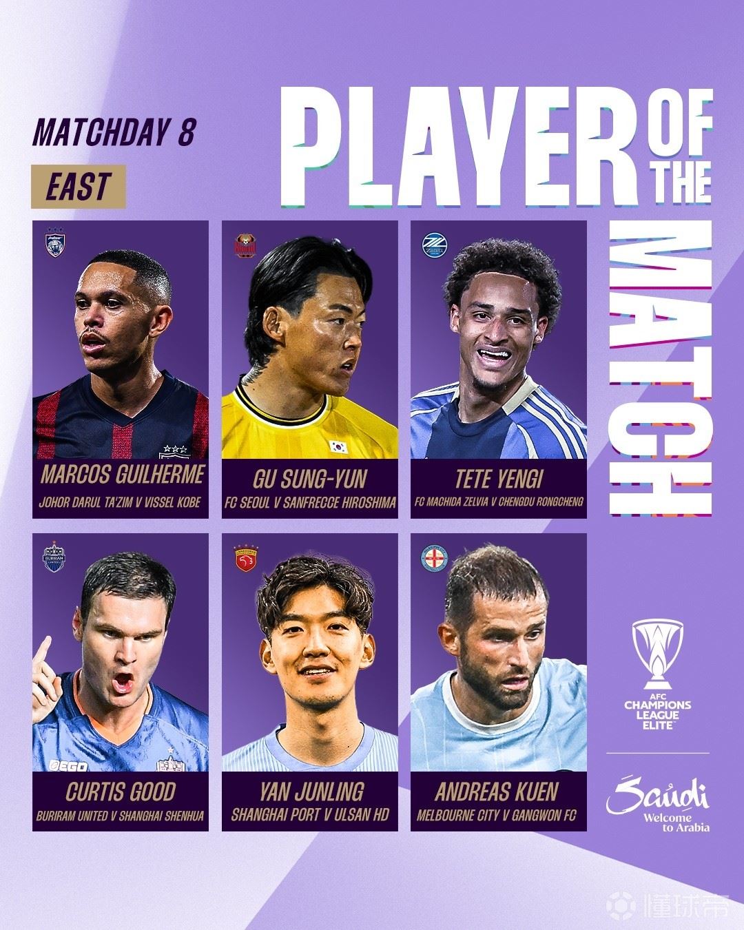 亚冠官方公布了亚冠精英联赛第八轮各场比赛单场最佳球员。