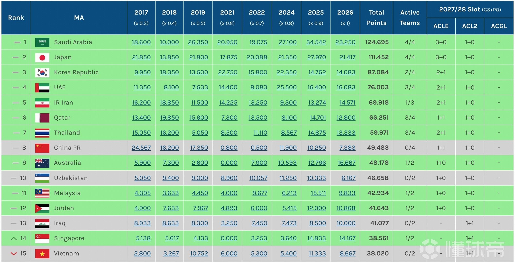 随着中超四支球队在亚冠赛场的全军覆没,中超球队本赛季的亚足联积分仅7.383分,不及去年的10.250分。