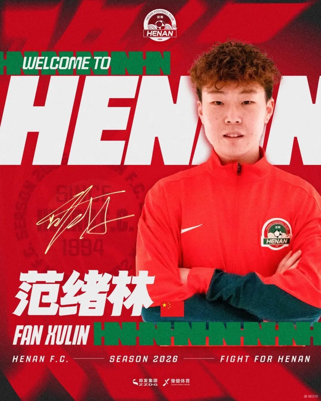 欢迎范绪林加入河南大家庭,期待你快速融入球队,与全体将士并肩作战,为河南足球拼下更多荣耀!