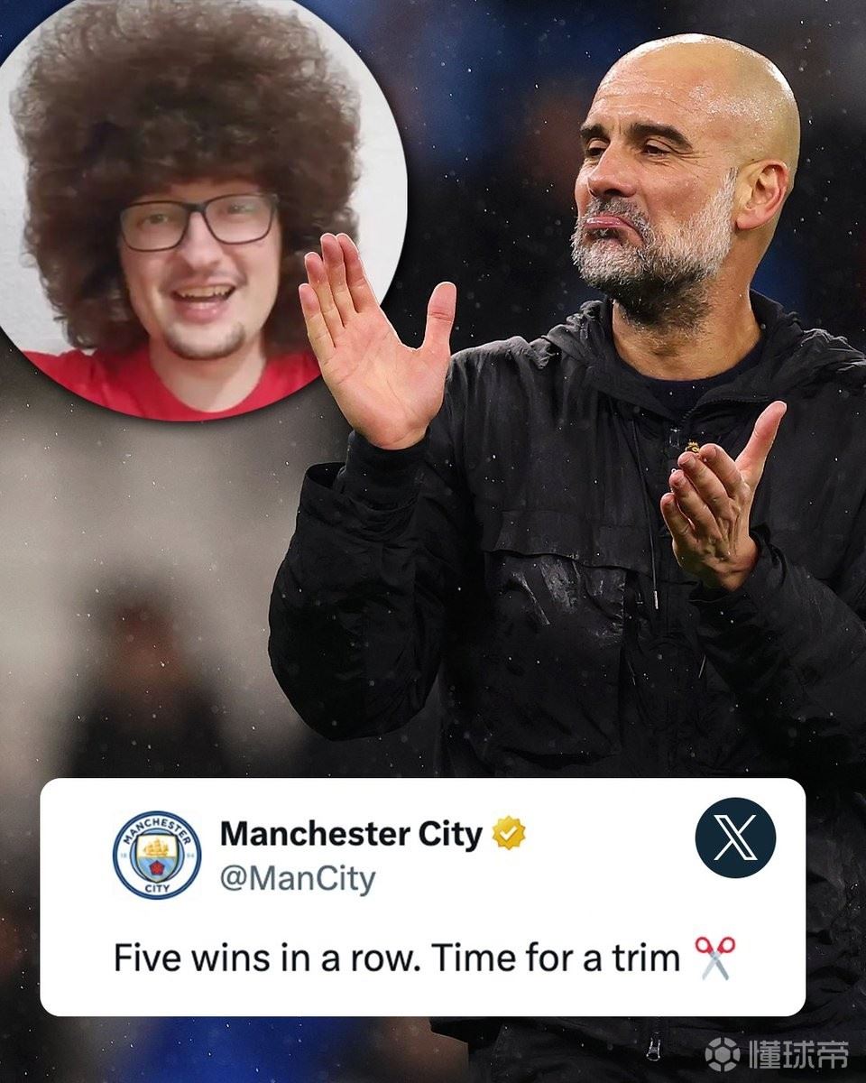 曼城在本轮英超战胜纽卡后取得各项赛事五连胜,赛后,曼城官方调侃曼联球迷“蓄发哥”,写道:“五连胜。是时候修剪一下了”