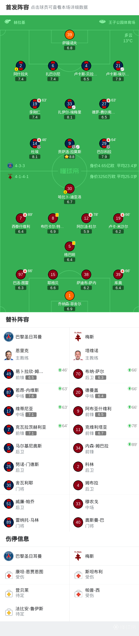 第63分钟,巴黎连换三人,克瓦拉茨赫利亚、维蒂尼亚、若昂-内维斯替补登场
