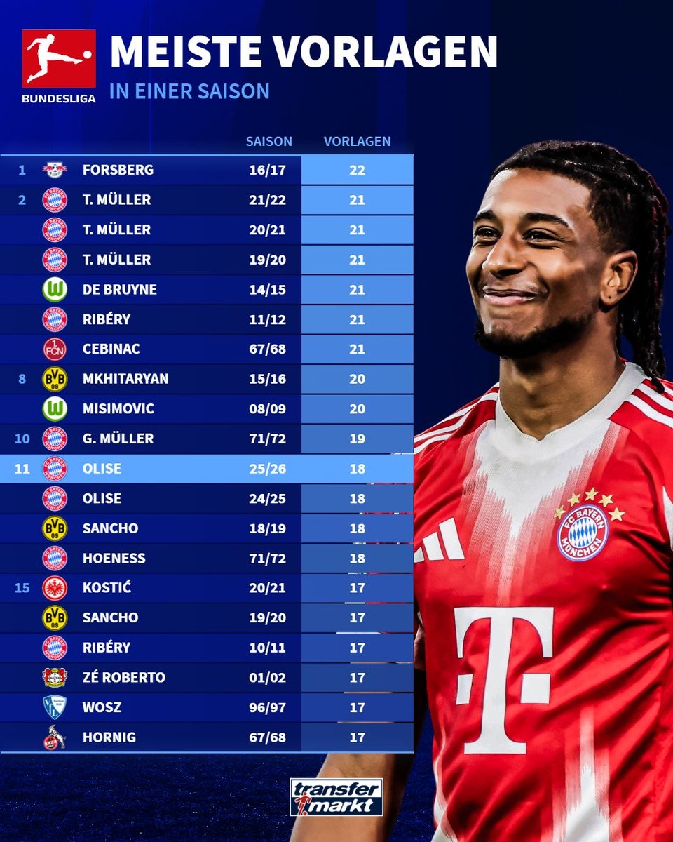 11. 奥利塞 拜仁慕尼黑 24-25赛季 18次