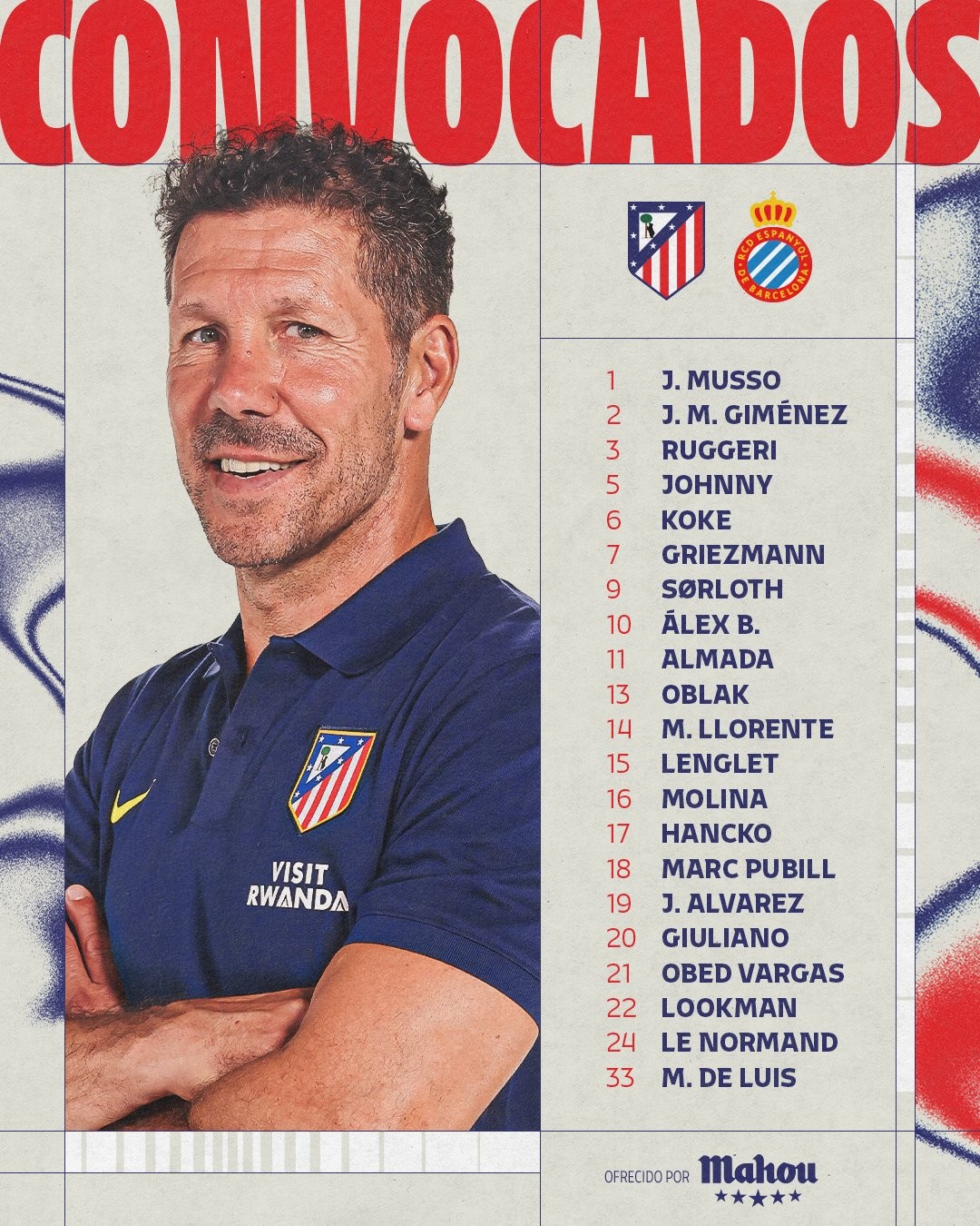 北京时间2月21日,马竞官方公布联赛主场对阵西班牙人的大名单。阿尔瓦雷斯领衔,门多萨、冈萨雷斯缺阵。