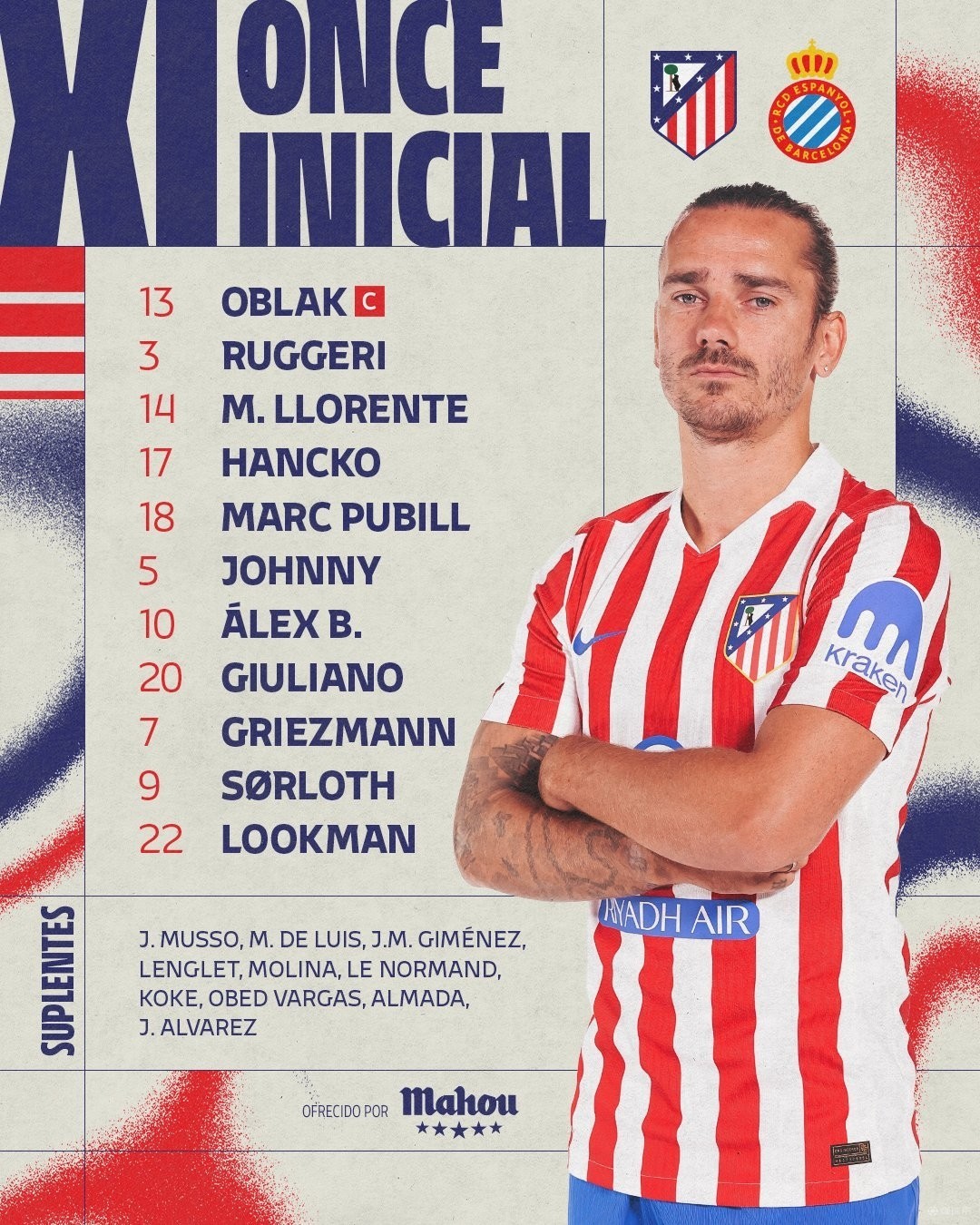 马竞首发:13-奥布拉克、14-马科斯-略伦特、18-普维尔、17-汉茨科、3-鲁杰里、20-小西蒙尼、5-卡多佐、10-巴埃纳、22-卢克曼、7-格列兹曼、9-瑟洛特