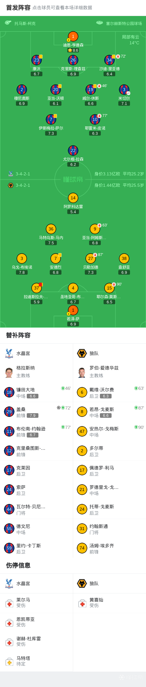 北京时间2月22日英格兰足球顶级联赛第27轮,水晶宫主场对阵狼队。狼队阿罗科达雷丢点,克雷伊奇染红,水晶宫盖桑破门。最终比分水晶宫 1-0 狼队。
