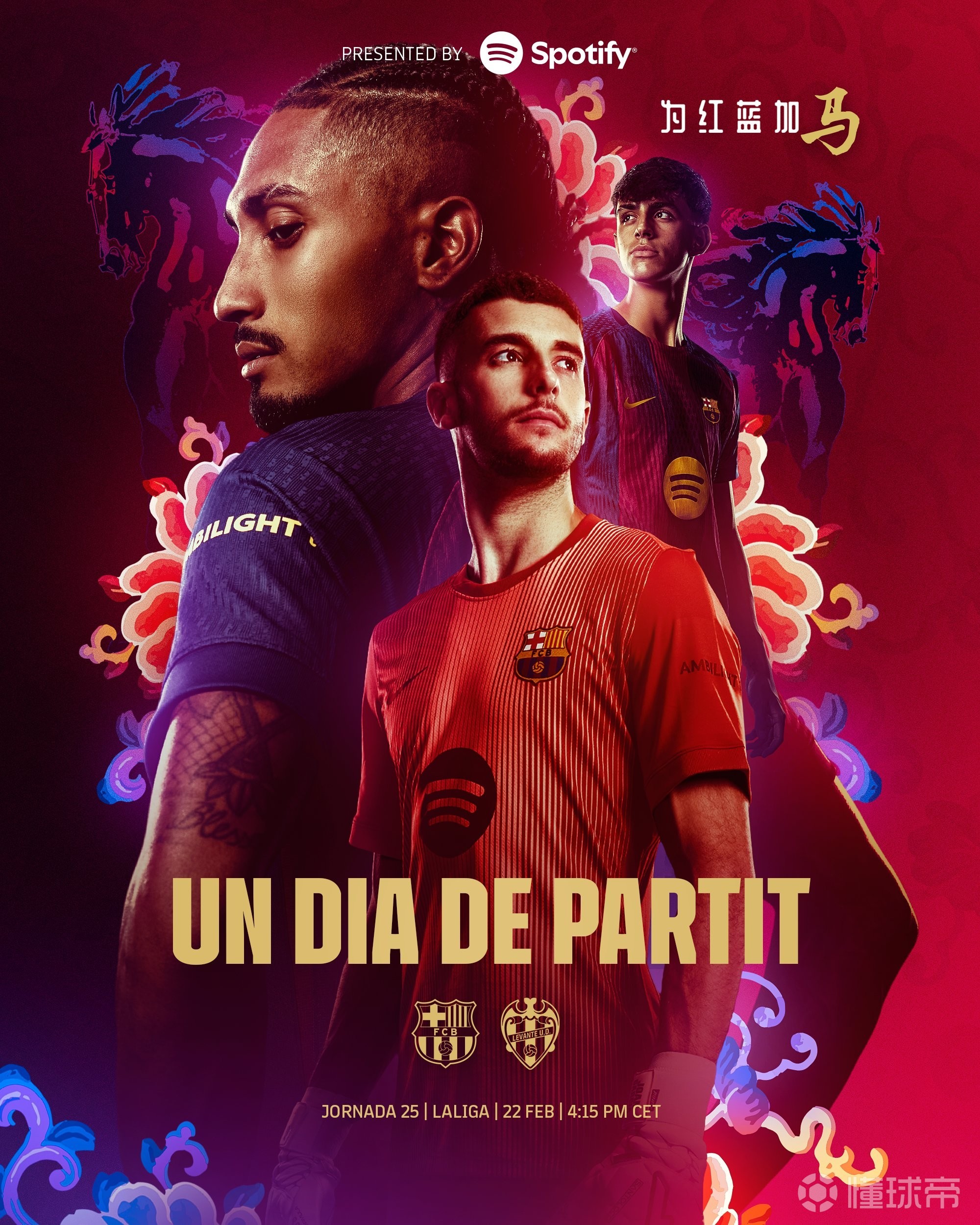 巴萨赛前海报以农历马年春节为主题,并用中文写着“为红蓝加马”。在海报上,霍安-加西亚、拉菲尼亚、贝尔纳尔上镜。
