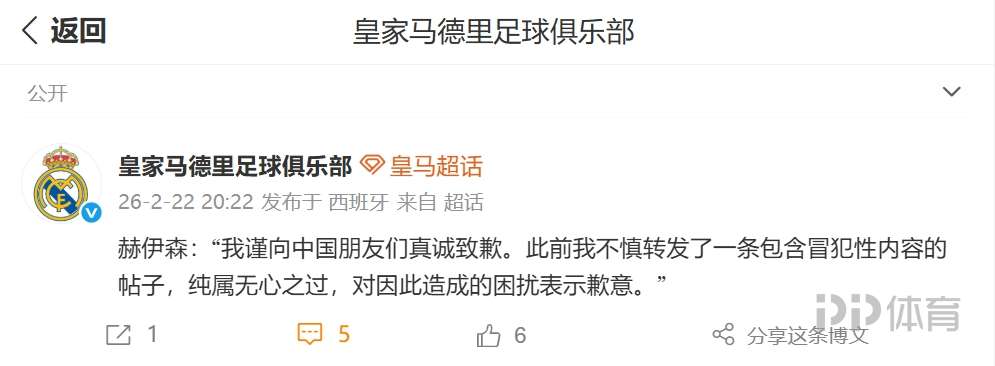 22日晚,皇马官方微博发布了赫伊森的道歉内容,内容如下。