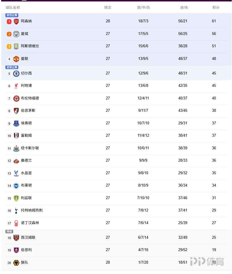 本轮英超,曼联1-0客胜埃弗顿,曼联近6轮联赛拿下5胜1平,积分榜上重回第4。27轮过后,阿森纳多赛一场61分领跑,曼城56分第2,维拉51分第三,曼联48分第4,切尔西、利物浦均45分排名第5和第6。
