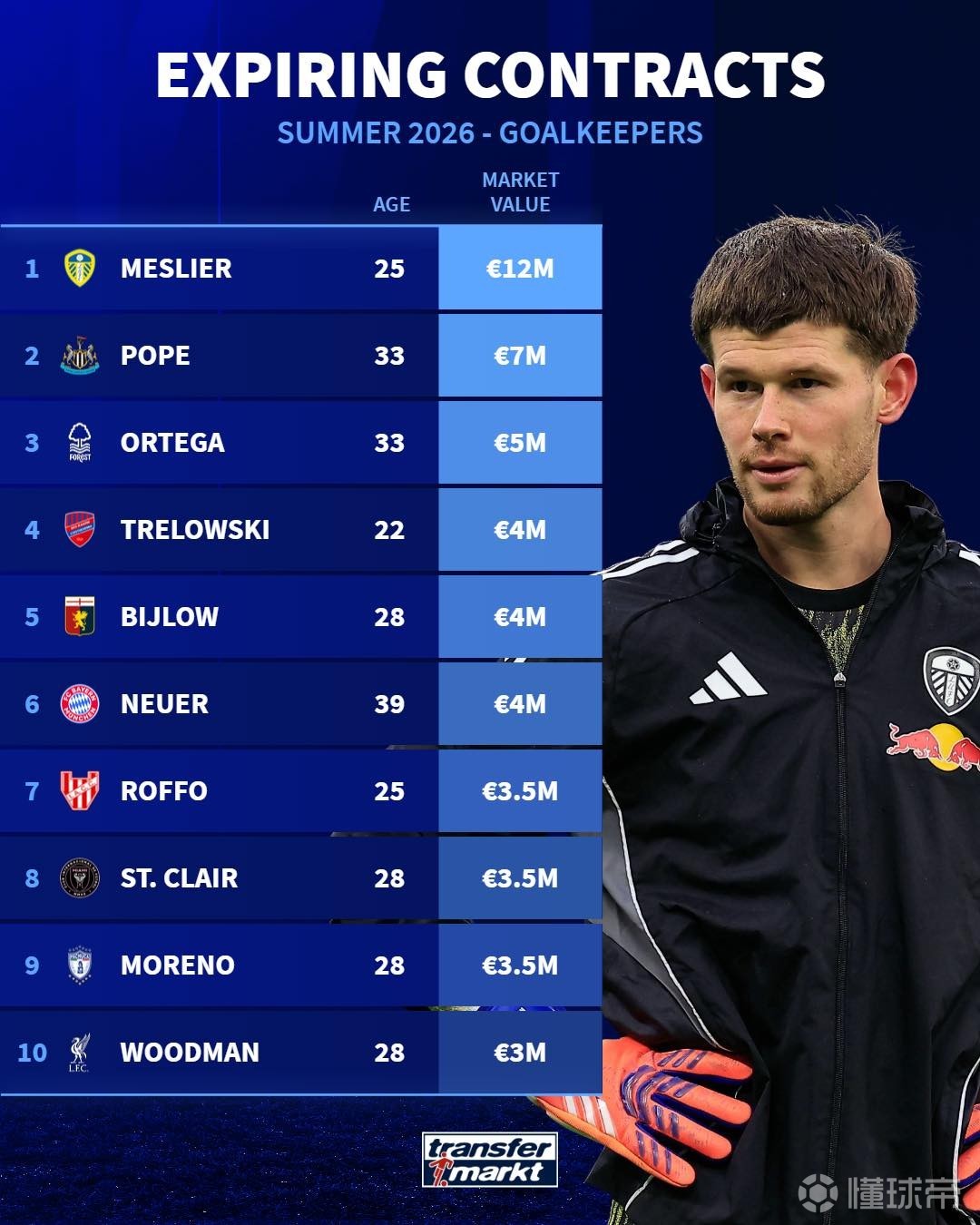 德国转会市场统计了今夏合同到期的十大门将,其中球员按照身价从高到低排序。