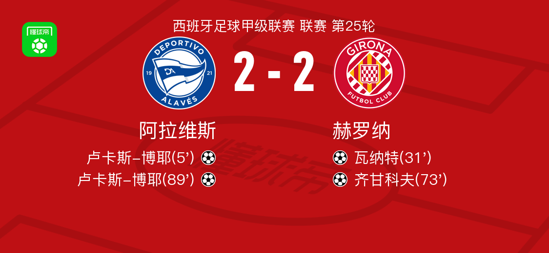 北京时间2月24日西班牙足球甲级联赛 联赛 第25轮,阿拉维斯主场对阵赫罗纳。阿拉维斯卢卡斯-博耶梅开二度。赫罗纳瓦纳特破门,齐甘科夫破门。最终比分阿拉维斯 2-2 赫罗纳。