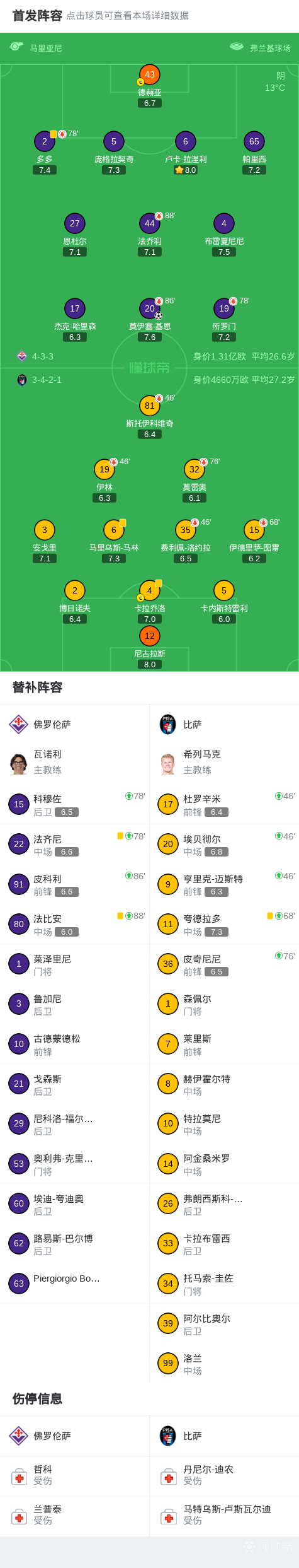第14分钟,基恩禁区得球,低射打进死角,佛罗伦萨1-0比萨