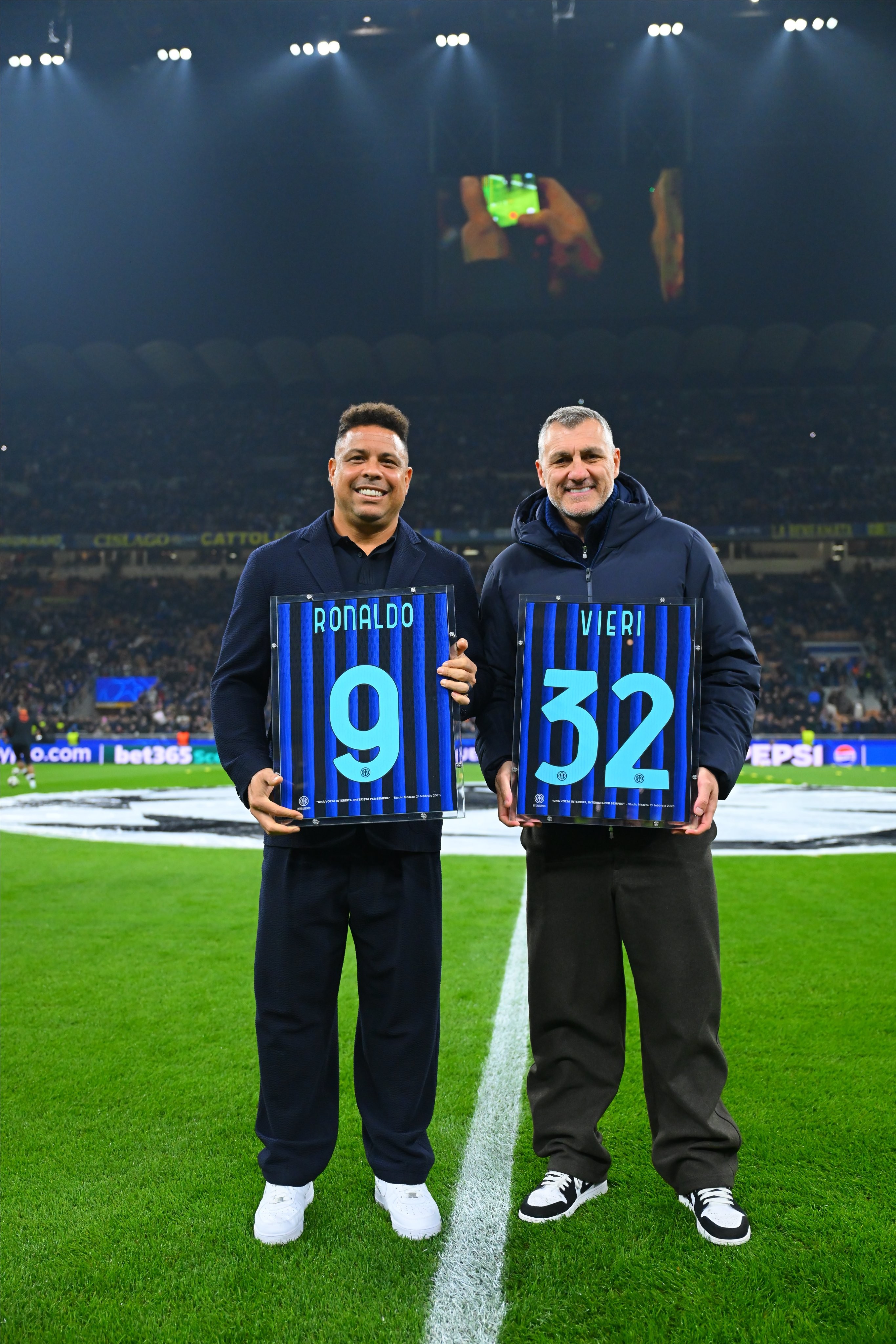 这两个人就是曾经的国米锋线传奇搭档罗纳尔多和维埃里,此番二人一同回到了曾并肩作战多年的圣西罗球场,并且还获得了俱乐部赠送的各自的纪念球衣。