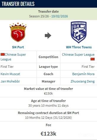 德转显示,明天从上海海港加盟武汉三镇的转会费为12.3万欧元,约100万人民币。
